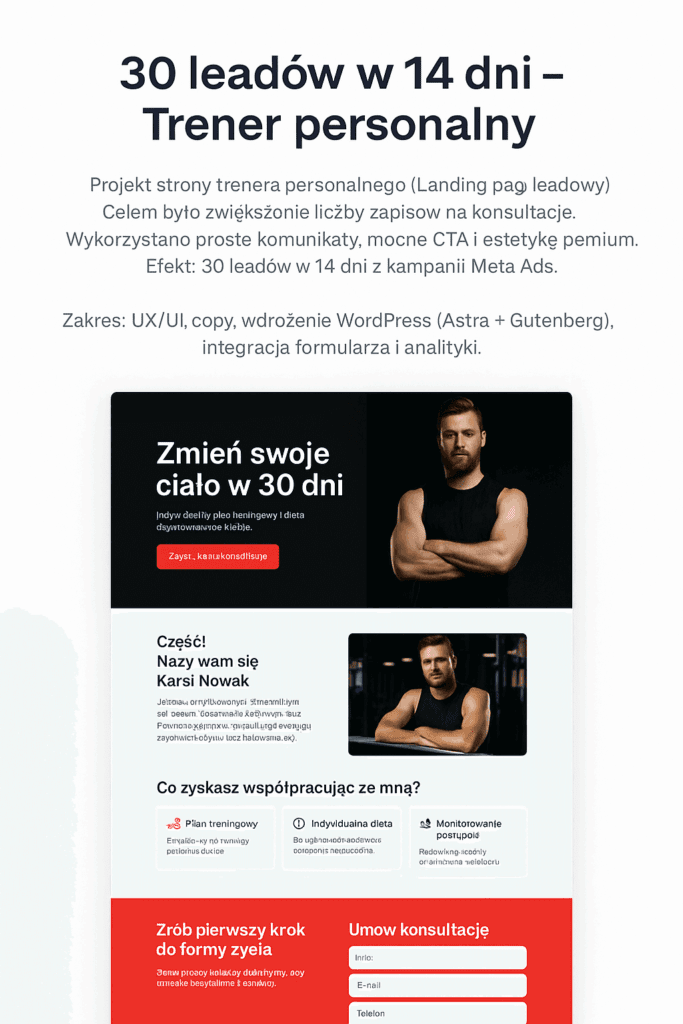 Zakres: UX/UI, copy, testy A/B, wdrożenie (WordPress + Gutenberg), optymalizacja konwersji i analityka.