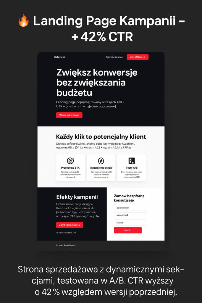 Testowane dwa warianty — nowy układ i copywriting przyniosły +42% CTR i +35% więcej konwersji.