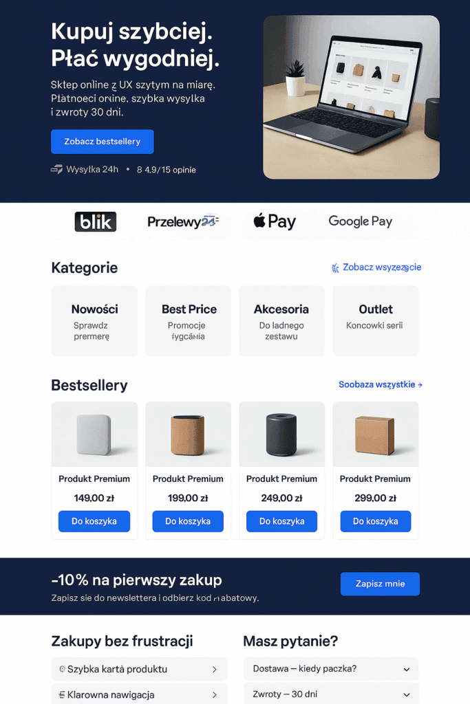 Zakres: architektura informacji, UX/UI, konfiguracja WooCommerce, bramki płatności (BLIK/Apple/Google Pay), GA4 + Pixel + GTM, optymalizacja wydajności.
